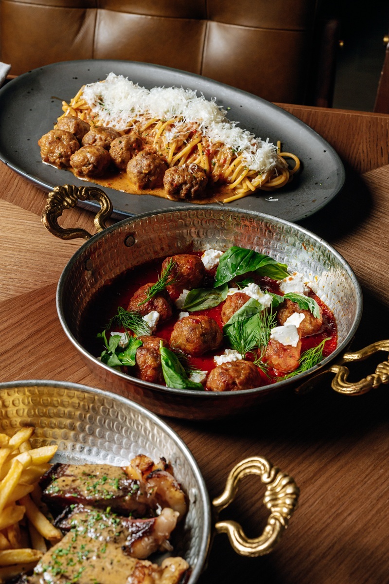 - Фрикадельки из стриплойна в пряном томатном соусе с сыром фета и травами.